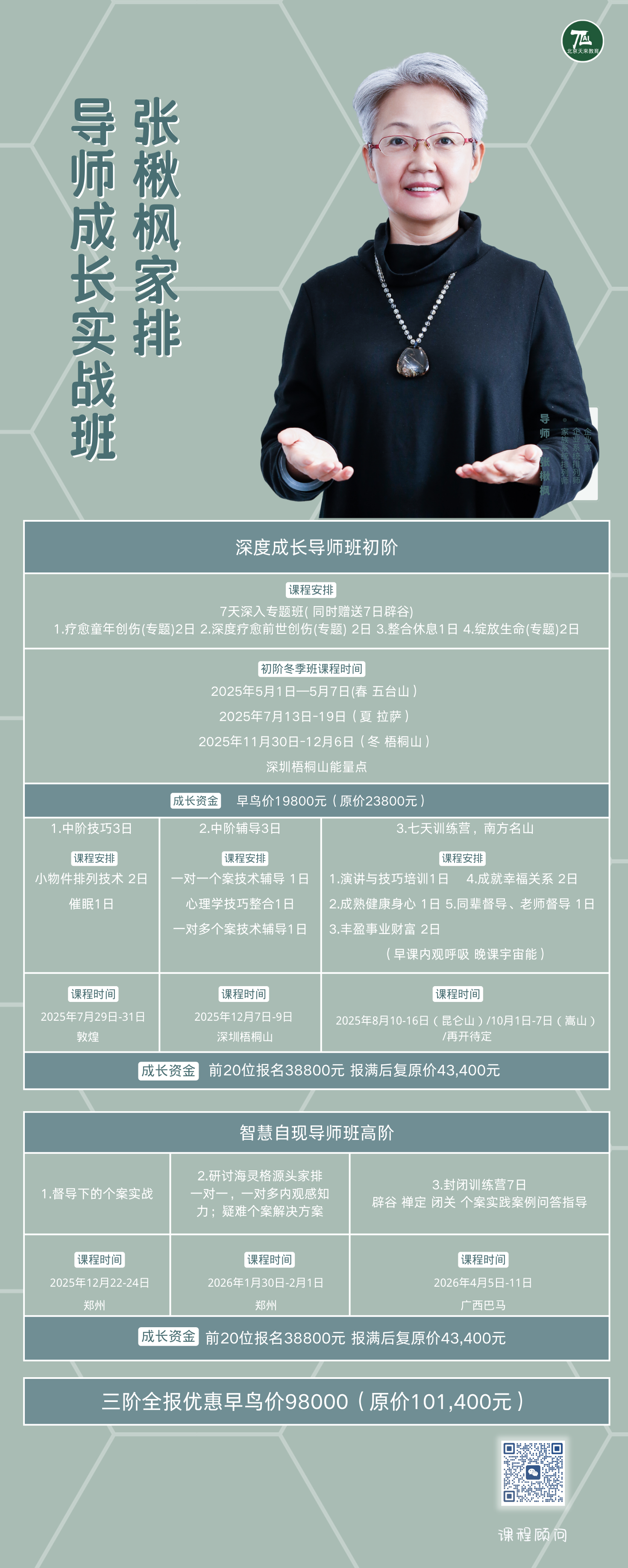 与道同行需要我们让自己的心灵保持开放和自由,不断地学习和探索,接受和顺应道的指引。只有当我们与道同行时,才能真正地实现自我成长和价值,让自己成为更好的人。张楸枫老师所带领的家排导师成长实战班也是基于这样一种理念而设计的。在家族系统排列领域十多年的耕耘,也让楸枫老师发心希望将海灵格老先生的这门学问发扬光大,利益更多众生。所以楸枫老师本着薪火相传的使命感,开发了这个系统性的排列师实战课程。课程共分为初中高阶三个阶段,每个阶段都有一个7天的能量点课程,这也是楸枫老师最受欢迎的核心课程板块。她将带领大家到各个能量点去打开我们的身体觉受,让身心与大自然的能量进行充分交流往来,这使得我们的身体作为一个信息/能量容器,将变得越来越敏锐。