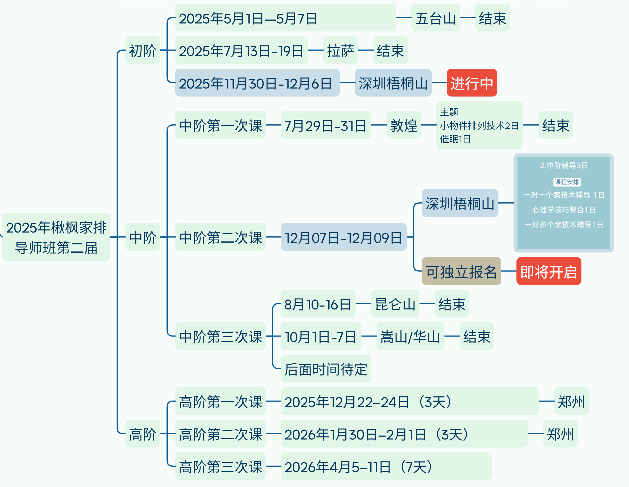 继10月的深圳梧桐山高阶第二次课程之后,楸枫老师将于11月30日–12月6日再次前往深圳梧桐山,开启为期 7 天的初阶成长实战营。梧桐山位于深圳东部,是“鹏城第一峰”,山海相接、云雾环绕,自古被视为山脉汇聚、气息贯通之地。在系统排列的视角中,梧桐山象征着天地相接的中轴,也是系统开启、根基奠定的原点。这里兼具山的稳固与海的流动,是自然节律与生命秩序彼此呼应之所。当我们在这样的场域中学习系统排列,不仅是技术的入门与扎根,更是一次与自然同频、与系统共振的觉察实践楸枫老师将带领大家,通过身体感知、场域对话与自然连结练习,让每位参与者在梧桐山的风、云、山脉的呼吸间,体验系统的流动与整合,回归生命的根基与力量。